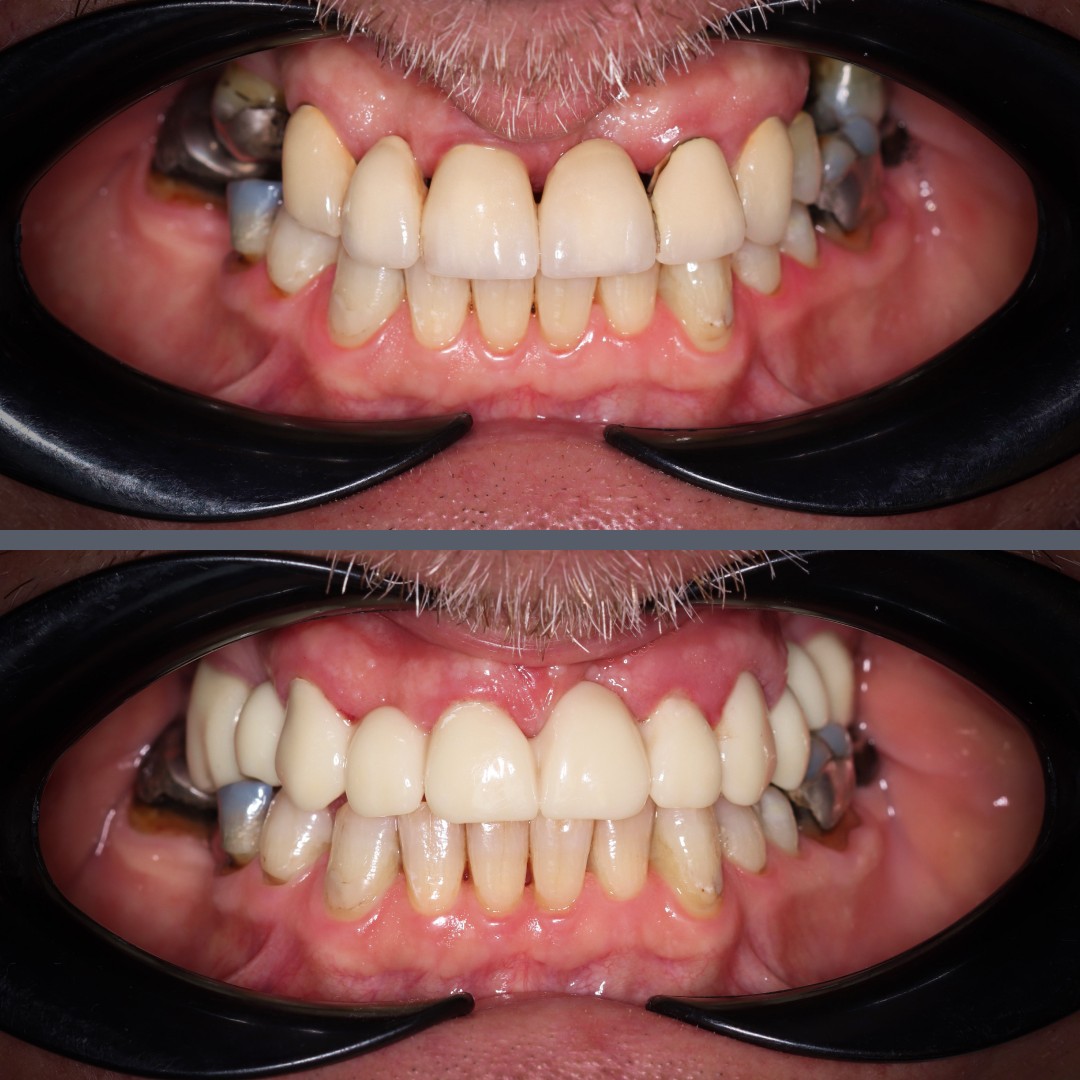 His teeth had not only lost their aesthetic appeal – the combination of missing teeth and the compromised condition of the remaining ones had also led to a misaligned bite and reduced chewing function. Our goal was to create an aesthetic smile while restoring proper bite alignment and optimal chewing.