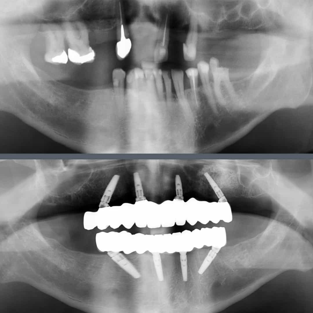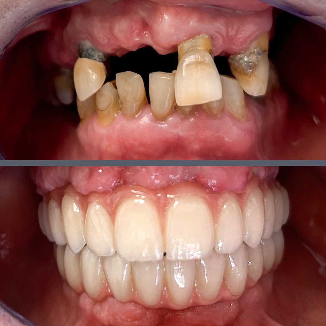 Our oral surgeon removed the loose teeth and placed the implants in one procedure. Two days later, our dental prosthetist fitted the custom-made temporary replacements onto the implants. After six months, our patient returned for his final zirconium bridges, completing the treatment.