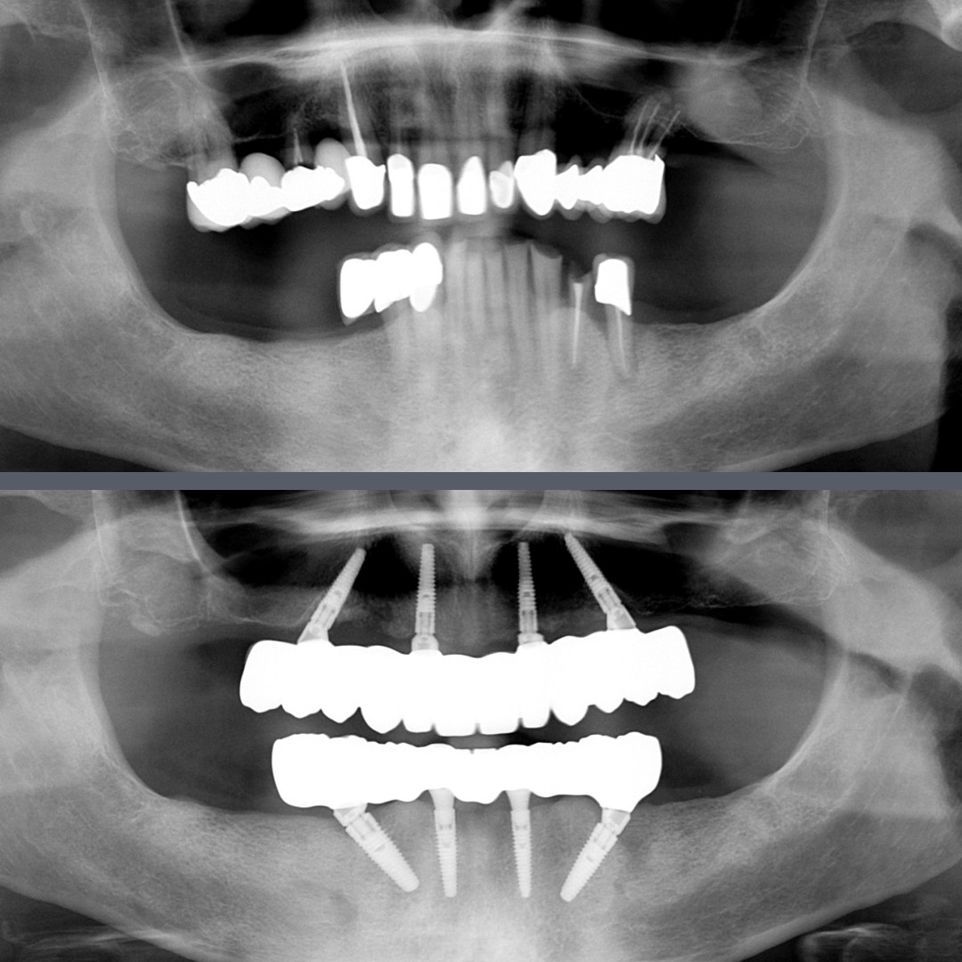 We removed all of the remaining teeth and immediately placed four Nobel Biocare implants in both the upper and lower jaws.