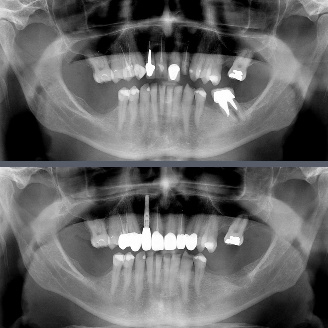 At the first appointment, we extracted a lower molar and an upper front tooth that had previously been root-treated but could no longer be saved. A dental implant was placed in the site of the upper front tooth. To maintain comfort and appearance throughout the healing period, we provided temporary crowns. These allowed the patient to continue her daily life with confidence and without aesthetic compromise. At the second visit, we fitted the final crowns. The zirconia restorations were attached to both the implant and the remaining natural front teeth.