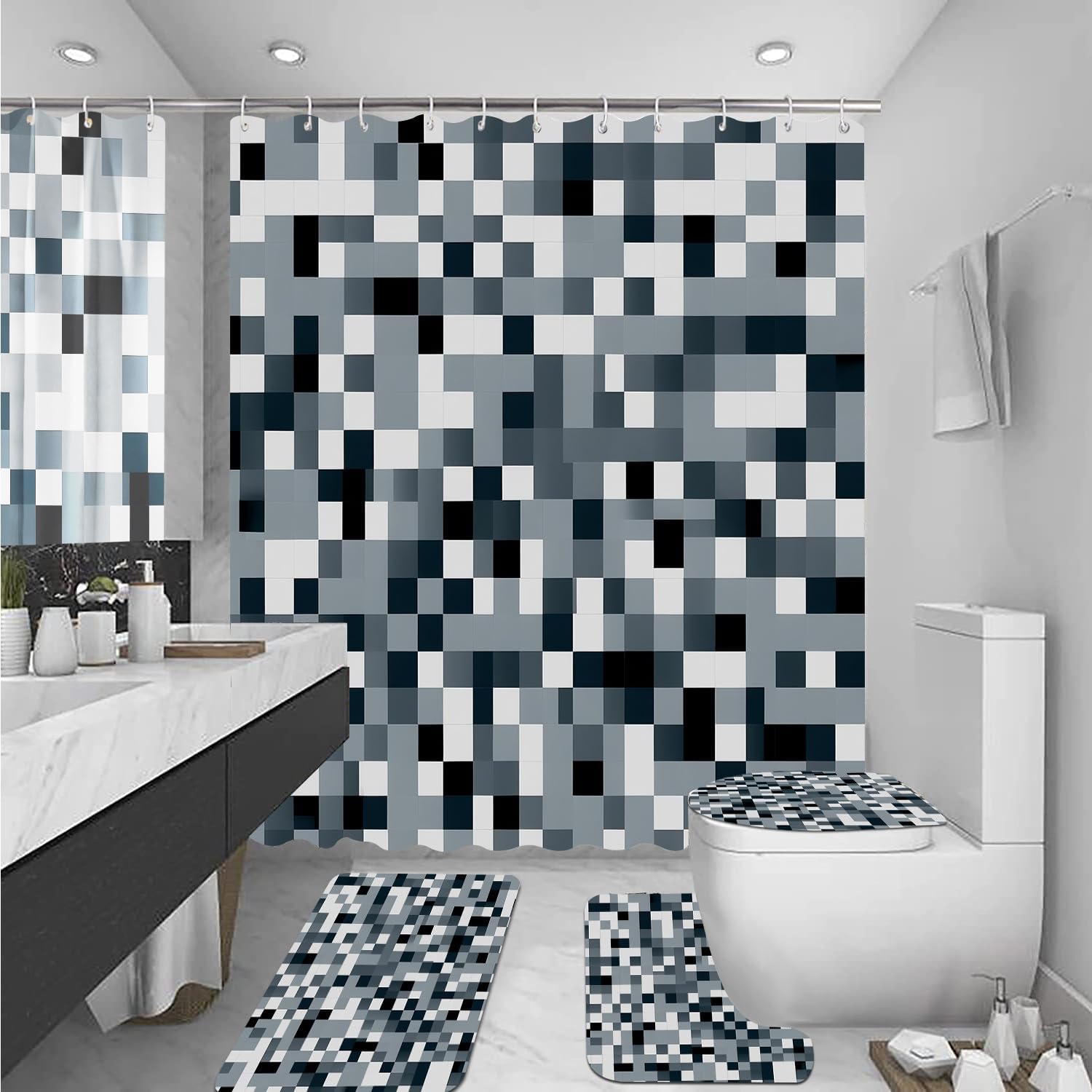 4PCS INCLUDING: Modern abstact shower curtains: 70.9"L×70.9"W, Bath Mat: 29.5"L×17.7"W, Toilet Lid Cover: 17.7"L×14.7"W, U-shaped Rug: 16.9"L×15"W, with 12 hooks. Before the first use, soak it in water, the wrinkles can be reduced well